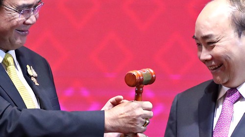 Ông Phúc nhận chiếc búa gõ từ thủ tướng Thái, biểu tượng Việt Nam sẽ là chủ tịch ASEAN trong thời gian