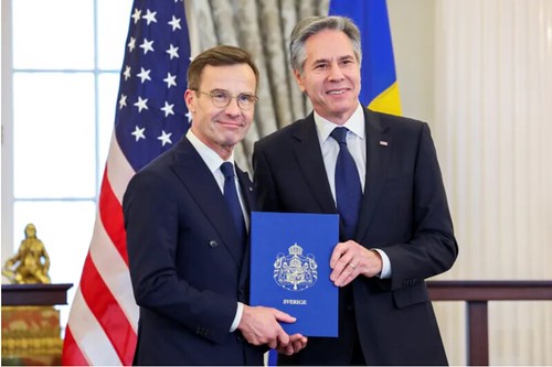 Thụy Điển, thành viên mới của NATO. © lexpress Ảnh minh họa Ngoại trưởng Hoa Kỳ Antony Blinken nhận hồ sơ gia nhập của Thụy Điển từ Thủ tướng Thụy Điển Ulf Kristersson để nước này gia nhập NATO tại Bộ Ngoại giao ở Washington [Amanda Andrade-Rhoades/Reuters]