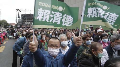 Cử tri biểu tình ủng hộ chiến dịch tranh cử tổng thống của ứng viên đảng Dân Tiến, Lại Thanh Đức, ngày 03/12/2023 tại Đài Bắc. AP - ChiangYing-ying