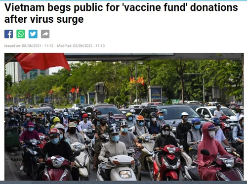 Báo Pháp France24 đăng tin rằng chính phủ Việt Nam "xin" công chúng đóng góp tiền cho quỹ vắc-xin Covid-19, 8/6/2021. Hình minh họa.