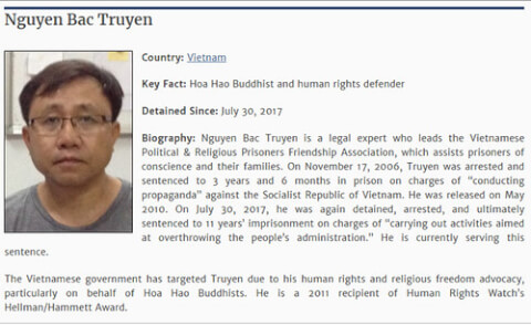 Ủy ban Tự do Tôn giáo Quốc tế của Hoa Kỳ (USCIRF) vừa ra thông báo quyết định bảo trợ cho ông Nguyễn Bắc Truyển và đưa ông vào dự án Tù nhân Lương tâm Tôn giáo. Ông Truyển là tín đồ Phật giáo Hòa hảo hiện đang thụ án tù 11 năm tại Việt Nam.