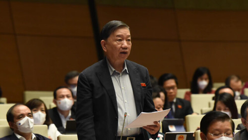 Bộ trưởng Công an Tô Lâm trả lời chất vấn tại Quốc hội ở Hà Nội hôm 10/11/2021. Ông Lâm, cùng chánh án Tòa án nhân dân tối cao Nguyễn Hòa Bình, bị 10 tổ chức quốc tế đề nghị đưa vào danh sách trừng phạt theo luật Magnitsky toàn cầu.