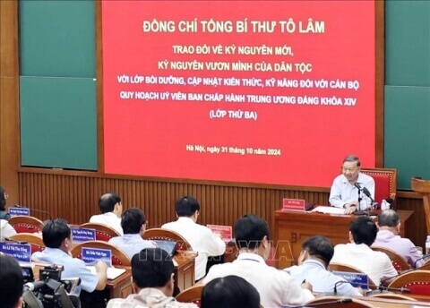 Tổng bí thư Tô Lâm trao đổi với các học viên cán bộ quy hoạch Ủy viên Trung ương Đảng khóa XIV về kỷ nguyên mới, kỷ nguyên vươn mình của dân tộc. Ảnh : Thống Nhất/TTXVN