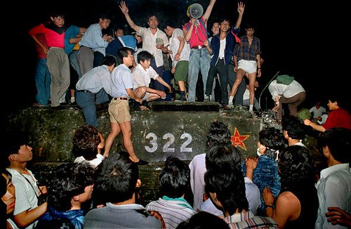 Người biểu tình trên một chiếc xe bọc thép ngay bên ngoài Quảng trường Thiên An Môn ở Bắc Kinh ngày 4/6/1989 - CreditJeff Widener / Associated Press