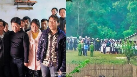 Ảnh phải : Công an bao vây tháo bỏ một nhà tang lễ của đạo Dương Văn Mình vào năm 2013. Nguồn : Youtube Thanh Phạm/ BPSOS đã dẫn.
