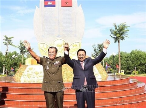 Thủ tướng Phạm Minh Chính (và Thủ tướng Hun Sen thể hiện tình đoàn kết tại Khu X6, xã Lộc Tấn, huyện Lộc Ninh, tỉnh Bình Phước, Việt Nam, ngày 20/6/2022. Khu X6 là điểm dừng chân của Thủ tướng Hun Sen con đường cứu nước Campuchia thoát khỏi chế độ diệt chủng Pol Pot. (Ảnh : TTXVN)