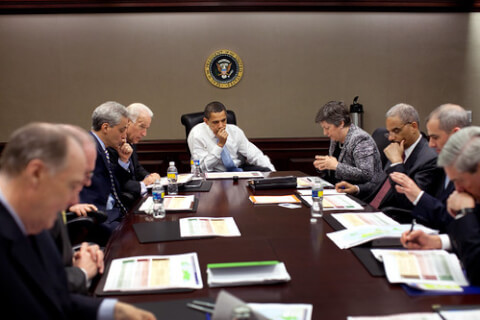 Tổng thống Barack Obama họp Bộ tham mưu ngày 24/4/2009 để nhận định tình hình và đối phó với đại dịch H1N1 đang lây lan trên lãnh thổ. Ảnh Wikipedia