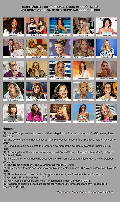 11. Trên 40 phụ nữ Hoa Kỳ và ngoại quốc công khai tố cáo Trump tấn công tình dục. Hai trường hợp đang được tòa án cứu xét.