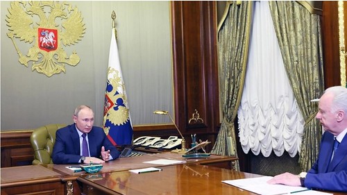 Tổng thống Nga Vladimir Putin họp với lãnh đạo Ủy ban điều tra về vụ nổ cầu Kerch, Alexander Bastrykin, tại Saint-Pétersbourg, ngày 09/10/2022. AP - Gavriil Grigorov