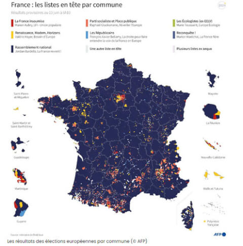 Bản đồ kết quả của bầu cử Quốc hội lập pháp Châu Âu tại Pháp ngày 9/6/2024 : Đảng cực hữu (màu xanh dương đậm) dẫn đầu 90% tổng số đơn vị bầu cử.