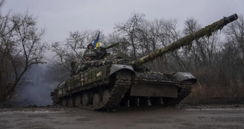 Xe tăng của quân Ukraine tiến về mặt trận gần Bakhmut, miền đông Ukraine, ngày 08/03/2023. AP - Yevgeny Maloletka