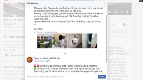 Trước sức ép của dư luận, trang fanpage của công an Hà Nội đành phải sửa bài nhưng cũng chỉ sửa cho có. Bài được chỉnh sửa để thêm câu "cùng người dân" vào câu đầu và câu nói về đục tường thay vì chỉ có "công an Gia Lâm" và "lực lượng chức năng". Nhưng họ vẫn giữ câu : "Đến 18h cùng ngày, Công an huyện Gia Lâm đã giải cứu thành công và đưa cháu bé đến trạm y tế thị trấn để chăm sóc sức khỏe". Câu này nên thêm mấy chữ "ngắm người dân" vào trước đoạn "giải cứu thành công" sẽ phản ánh đúng những gì diễn ra.