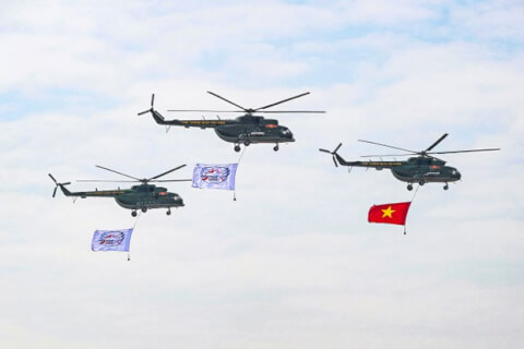 Ba chiếc trực thăng Mi do Nga sản xuất trong biên chế Quân đội Việt Nam bay biểu diễn trong ngày mở màn của hội chợ vũ khí 2024 - AFP