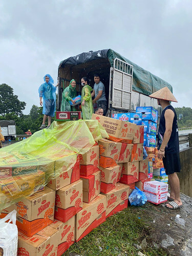 Nhóm thiện nguyện mang những nhu yếu phẩm do mọi người quyên góp, hỗ trợ cho người dân vùng bị ngập lụt. Ảnh : NVCC.