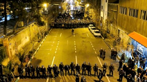 Cảnh sát đối mặt với người biểu tình vụ máy bay dân sự Ukraine bị Iran bắn rơi. Đại học Amir Kabir, Tehran, 11/01/2020.