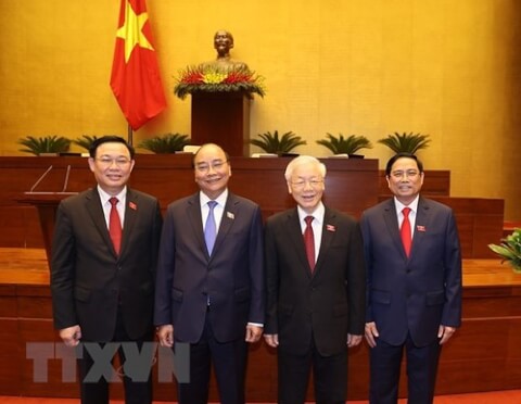 Bốn lãnh đạo cao nhất của Việt Nam (từ trái qua) : Chủ tịch quốc hội Vương Đình Huệ, Chủ tịch nước Nguyễn Xuân Phúc, Tổng bí thư Đảng cộng sản Nguyễn Phú Trọng, Thủ tướng Phạm Minh Chính. HÌnh chụp hôm 20/7/2021 ở Hà Nội - AFP