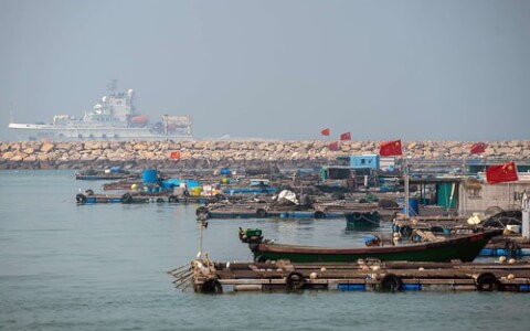 Tàu cá Trung Quốc (màu trắng phía xa) cập bến trước khi mạo hiểm vào Biển Đông (Artyom Ivanov / TASS qua