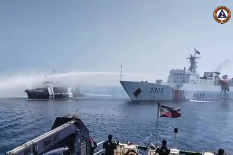Hình chụp video từ tàu tuần duyên của Philippines hôm 9/12/2023 cho thấy tàu hải cảnh Trung Quốc (phải) phun vòi rồng vào tàu của Philippines gần bãi Scarborough Shoal ở Biển Đông - Philippine Coast Guard (PCG) / AFP