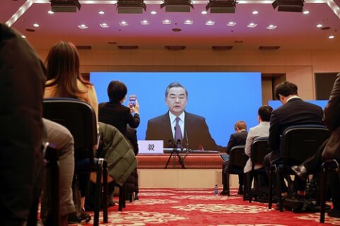 Ngoại trưởng Trung Quốc Vương Nghị trong cuộc họp báo trực tuyến bên lề kỳ họp Quốc hội ở Bắc Kinh hôm 7/3/2021 - Reuters