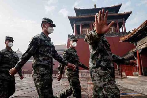 Binh sĩ Quân đội Giải phóng Nhân dân Trung Quốc diễu hành cạnh lối vào Tử Cấm Thành trong lễ khai mạc một cuộc họp chính trị ở Bắc Kinh hôm 21/05/2020. (Ảnh : Nicolas Asfouri / AFP qua Getty Images)
