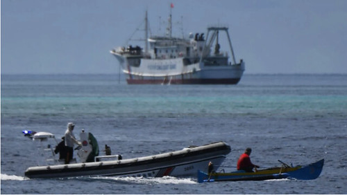 Tàu cá Philippines (gần) và tàu tuần dương của Trung Quốc (xa) gần bãi cạn Scarborough. Ảnh : Ted Aljibe/AFP via Getty Images