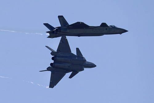 Hai máy bay chiến đấu tàng hình J-20 của Không quân Quân đội Giải phóng Nhân dân Trung Quốc (PLA) trình diễn trong Triển lãm Hàng không và Vũ trụ Quốc tế Trung Quốc lần thứ 12 ngày 6 tháng 11 năm 2018 tại Quảng Đông, Trung Quốc. AP