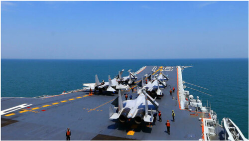 Các chiến đấu cơ J15 trên hàng không mẫu hạm Liêu Ninh của Trung Quốc trong một cuộc tập trận ngày 24/04/2018. AFP