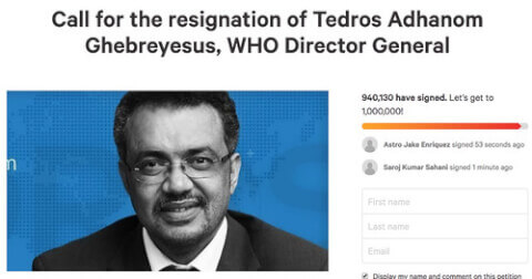 Gần một triệu người trên khắp thế giới đồng ký tên vào thỉnh nguyện thư gửi Liên Hiệp Quốc, yêu cầu Tổng giám đốc Tổ chức Y tế Thế giới WHO, ông Tedros Adhanom Ghebreyesus, phải từ chức. Trong một diễn biến khác, hôm qua, 14/4, Tổng thống Mỹ Donald Trump tuyên bố ngừng tài trợ cho WHO.
