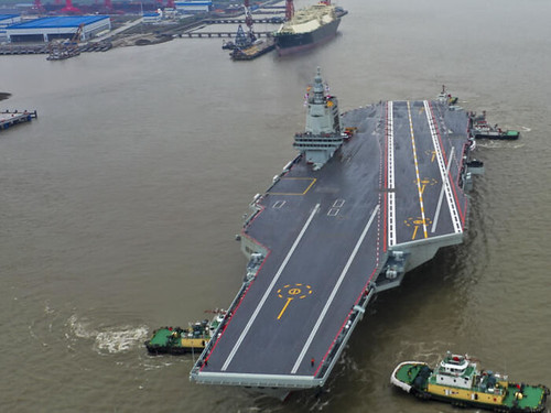 Tàu sân bay Phúc Kiến đang chuẩn bị từ xưởng đóng tàu tại Thượng Hải ra khơi thử nghiệm lần đầu, ngày 01/05/2024. AP - Pu Haiyang - Ảnh do Tân Hoa Xã công bố