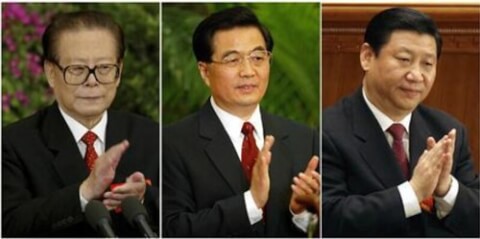Bức ảnh ghép cho thấy cựu Chủ tịch Trung Quốc Giang Trạch Dân (trái) vỗ tay trong bài phát biểu của ông tại Đại hội Đảng cộng sản Trung Quốc lần thứ 16 tại Đại Lễ đường Nhân dân ở Bắc Kinh ngày 8/11/2002, Hồ Cẩm Đào (giữa), Tổng bí thư Đảng cộng sản Trung Quốc, vỗ tay ở Bắc Kinh, ngày 15/11/2002, và Phó Chủ tịch Trung Quốc Tập Cận Bình vỗ tay ở Bắc Kinh, ngày 15/3/2008. Reuters/Andrew Wong/China Photos/Claro Cortes/Files
