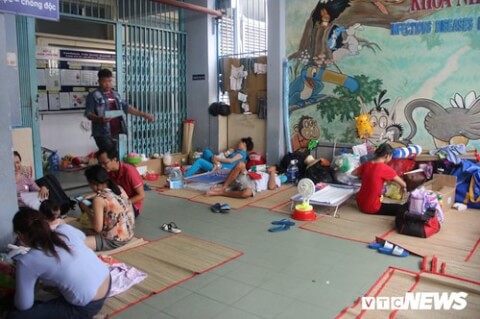 Người bệnh và người nhà nằm dưới đất, ngoài hành lang bệnh viện Nhi Đồng 1 năm 2018. Photo : vtc.vn