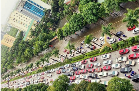 Khung cảnh ô tô tắc nghẽn kéo dài trên đường Quang Trung, Thành phố Vinh khi mưa xuống (Ảnh : MX).