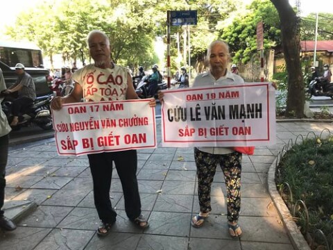 Bà Nguyễn Thị Việt - mẹ của tử tù Lê Văn Mạnh cùng ông Nguyễn Trường Chinh- bố của tử tù Nguyễn Văn Chưởng, cùng kêu oan cho con - Ảnh : Facebook Nguyễn Trường Chinh