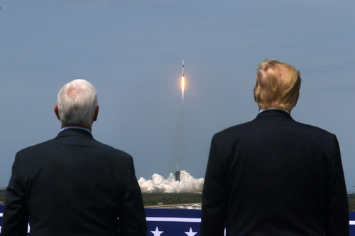 Tổng thống Mỹ Donald Trump và Phó Tổng thống Mỹ Mike Pence theo dõi vụ phóng tên lửa Falcon 9 của SpaceX Falcon 9 và phi thuyền Crew Dragon tại Trung tâm Không gian Kennedy ở Cape Canaveral, bang Florida, ngày 30 tháng 5, 2020.