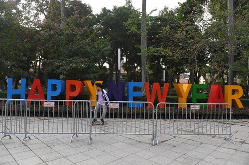 Một thanh niên đi ngang qua bảng hiệu "Chúc mừng Năm mới" ở Hà Nội. Hình chụp ngày 30/12/2020. AFP - Ảnh minh họa.