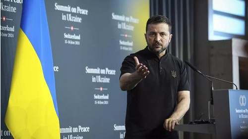 Tổng thống Ukraine Volodymyr Zelensky trong cuộc họp báo tại Thượng đỉnh Hòa Bình cho Ukraine, tại Obbürgen, Thụy Sĩ, ngày 16/06/2024. AP - Laurent Cipriani