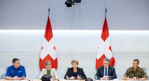 Các quan chức chính phủ và quân đội Thụy Sĩ tham dự một cuộc họp báo với giới truyền thông ngắn gọn trước hội nghị thượng đỉnh hòa bình ngày 15-16 tháng 6 của nước này đối với Ukraine, tại Bern, Thụy Sĩ, ngày 10 tháng 6 năm 2024 [Pierre Albouy / Reuters]