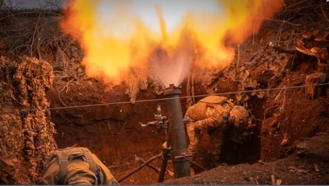 Binh lính Ukraine bắn súng cối về phía các vị trí của Nga ở tiền tuyến, gần Bakhmut, vùng Donetsk, Ukraine, hôm 3/3.