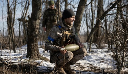 Một quân nhân Ukraine cầm quả đạn cối, vùng Donetsk, Ukraine, tháng 2 năm 2023