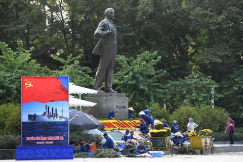 Công nhân đang dựng các tấm biển quanh tượng Lê Nin ở Hà Nội nhân kỷ niêm 100 năm Cách mạng tháng Mười Nga (1917) hôm 3/11/2017 - AFP