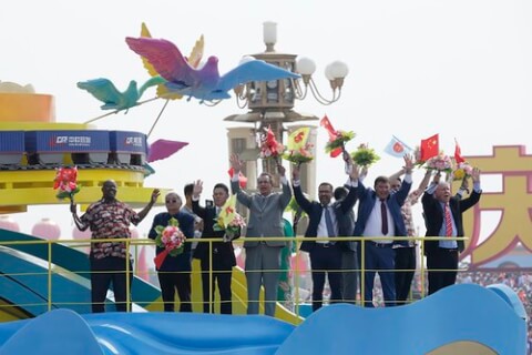 Khách nước ngoài trên một mô hình đường xe lửa cao tốc thuộc BRI trong diễu binh kỷ niệm 70 năm quốc khách Trung Quốc ở Bắc Kinh hôm 1/10/2019 - Reuters