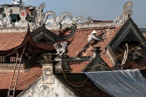 Công nhân sửa mái chùa ở Hà Nội hôm 2/6/2020 - AFP