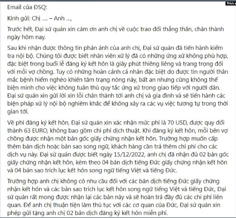 Ông Vũ Quang Minh – Đại sứ Việt Nam tại Đức mới đưa lên trang facebook của ông một email của Đại sứ quán Việt Nam tại Đức vừa gửi chị nào đó và anh nào đó để cám ơn về "cuộc trao đổi thẳng thắn, chân thành ngày hôm nay". Theo đó Đại sứ quán đã tiến hành kiểm tra nội bộ. Chúng tôi được biết nhân viên xử lý đã có những ứng xử không phù hợp, đặc biệt trong buổi lễ đăng ký kết hôn là giây phút thiêng liêng và trang trọng đối với mỗi vợ chồng. Tuy có những hoàn cảnh cá nhân đặc biệt do được tin người thân mắc bệnh hiểm nghèo khiến tâm trạng nóng nảy, bất an nhưng cũng không thể biện minh cho việc không tuân thủ quy tắc ứng xử trong giao tiếp với người dân. Đại sứ quán xin gửi lời xin lỗi chân thành tới anh chị và gia đình và sẽ tiến hành các biện pháp xử lý nội bộ nghiêm khắc để không xảy ra các vụ việc tương tự trong thời gian tới...