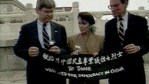 Ảnh tư liệu : Ảnh chụp màn hình TV ngày 04/09/1991 cho thấy bà Nancy Pelosi (g) cùng hai dân biểu Ben Jones (trái) và John Miller (phải) cầm biểu ngữ với dòng chữ "Gửi những người đã chết vì dân chủ ở Trung Quốc" trên quảng trường Thiên An Môn, Bắc Kinh, Trung Quốc. AP