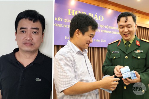 Tổng Giám đốc công ty Việt Á thời điểm ra mắt bộ xét nghiệm Covid-19 (ảnh phải) và lúc bị Bộ Công an bắt (ảnh trái). Bộ Công an/TCVN.GOV.VN