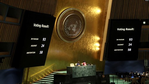 Đại hội đồng Liên Hiệp Quốc ngày 7/4 đã bỏ phiếu khai trừ Nga khỏi Hội đồng Nhân quyền (UNHRC) với các cáo buộc nước này vi phạm nhân quyền ở Ukraine, theo đó có 93 phiếu thuận, 24 phiếu chống và 58 phiếu trắng.