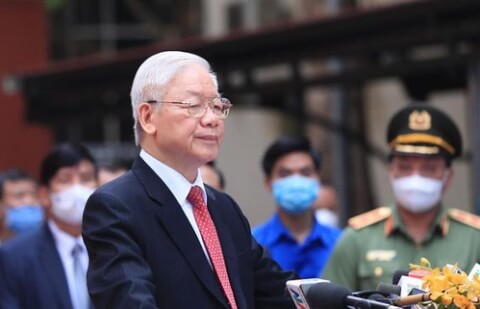 Tổng bí thư Đảng cộng sản Việt Nam Nguyễn Phú Trọng phát biểu trước truyền thông tại Hà Nội, Việt Nam, 23/05/2021. AP-Hau Dinh