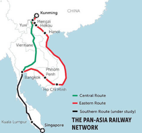 Về mặt thực tiễn, các tuyến đường sắt được quy hoạch sẽ tích hợp mạng lưới của Việt Nam vào mạng lưới đường sắt xuyên Á, hiện có ba tuyến : tuyến ở giữa đi từ Côn Minh đến Lào và Bangkok ; tuyến phía tây đi qua Miến Điện và Thái Lan ; tuyến phía đông dự kiến đi qua Việt Nam, Cam Bốt và Thái Lan và kéo dài xuống phía nam tới Malaysia và Singapore.