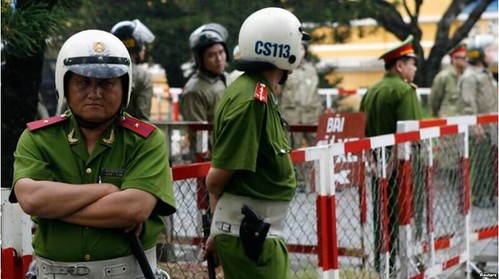 Cảnh sát canh gác trong một phiên tòa xét xử người bất đồng chính kiến ở thành phố Hồ Chí Minh hồi năm 2010