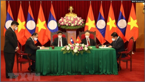 Tổng bí thư, Chủ tịch nước Lào Thongloun Sisoulith và Tổng Bí thư Việt Nam Nguyễn Phú Trọng đã chứng kiến việc ký kết các văn kiện hợp tác hôm 28/6/2021. Photo Bao Quoc te